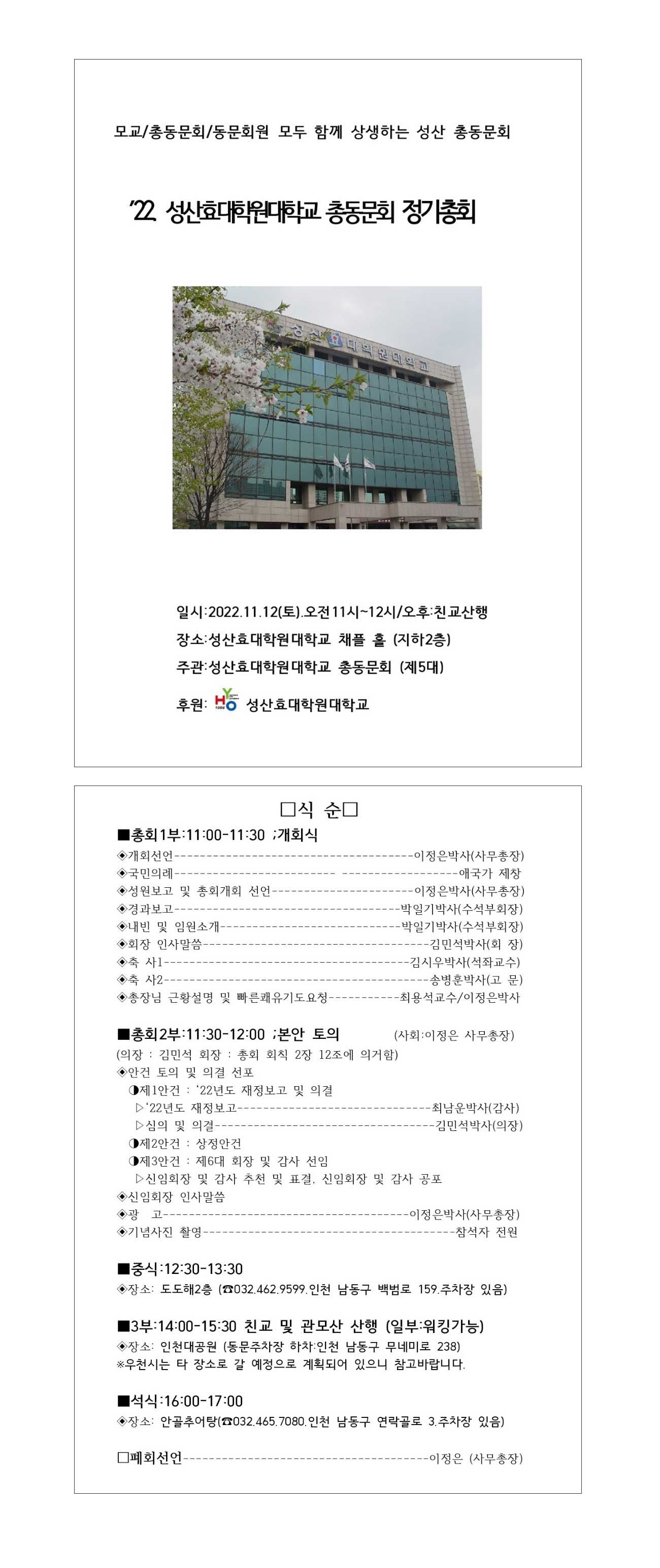 2022. 11.12(Åä) 11:00¿¡ °³ÃÖµÈ ¼º»êÈ¿´ëÇпø´ëÇб³ Ãѵ¿¹®È¸ Á¤±âÃÑȸ´Â ¿ª´ë ¾î´À ¶§º¸´Ù ¼ºÈ²¸®¿¡ ¼º°øÀûÀ¸·Î °³ÃÖÇÏ°í ¸¶ÃƽÀ´Ï´Ù.